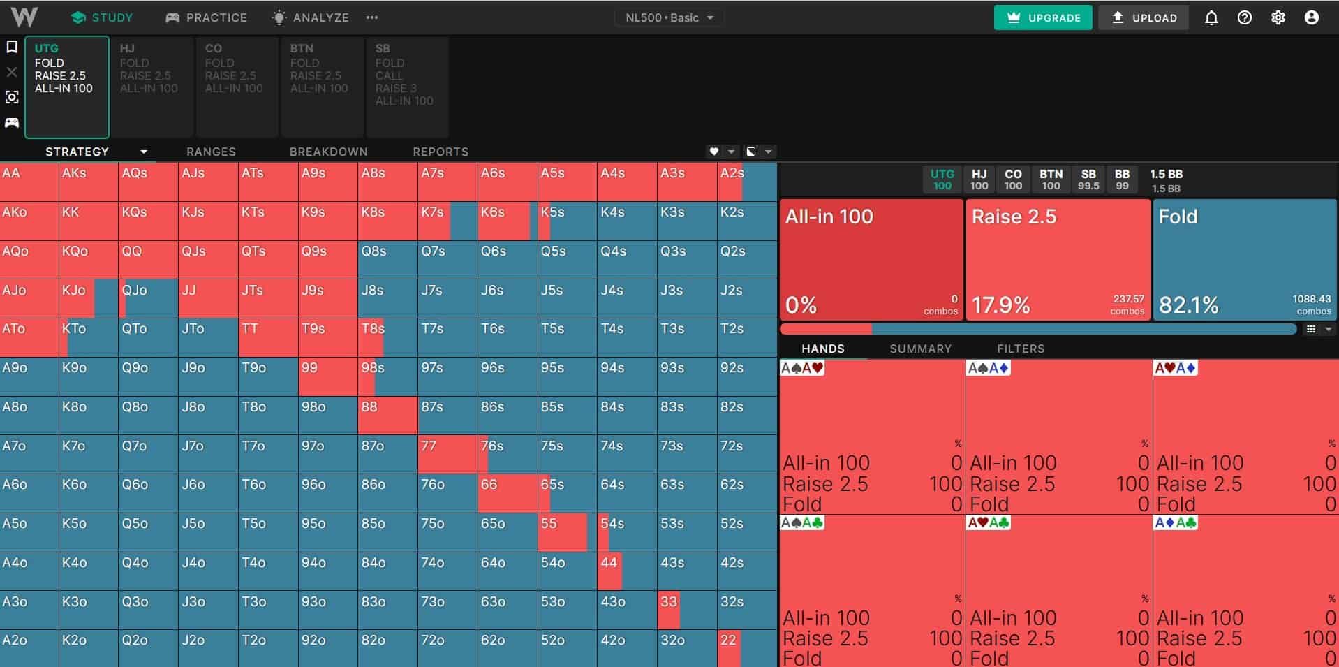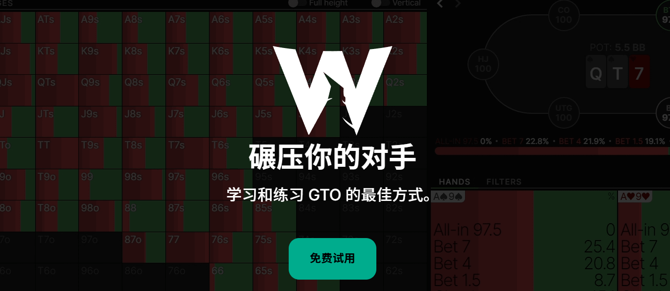 GTO Wizard:强烈推荐。它提供了一个庞大的GTO策略数据库,涵盖从翻前到河牌的各种情况。你可以进行模拟测验,对比你的选择与GTO的差异,是最高效的学习方式之一。